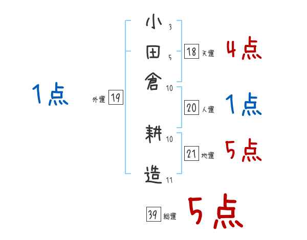 天運![]() | 小田倉耕造さんの天運は18画の4つ星!情熱的で剛気。忍耐力があり信頼される。 家系が持つ宿命的な運勢を表します。祖先から受け継いだ苗字ですので自分の力が及びません。家柄を象徴します。 |