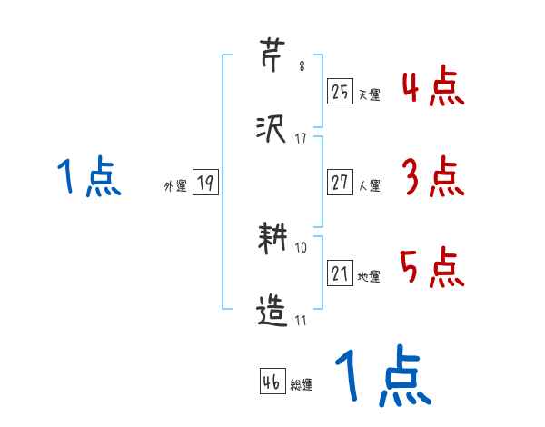 総運![]() | 芹沢耕造さんの総運は46画の1つ星!迷走することが多く苦労するかも。目先のことにとらわれないように。 あなたの人生を表す1番重要な運勢です。生涯を通じて影響する総合運となり、主に50歳以降の晩年期に影響を及ぼします。 |