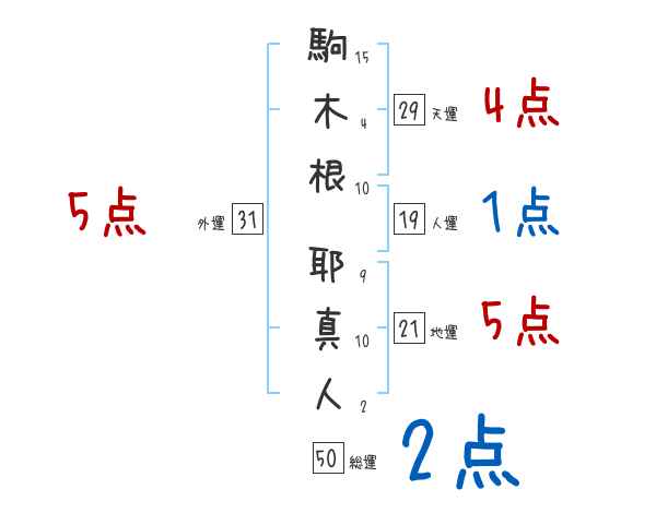 天運![]() | 駒木根耶真人さんの天運は29画の4つ星!完全主義で才能がある。厳格な心の持ち主。 家系が持つ宿命的な運勢を表します。祖先から受け継いだ苗字ですので自分の力が及びません。家柄を象徴します。 |
