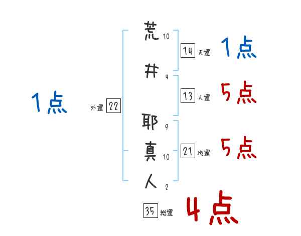 天運![]() | 荒井耶真人さんの天運は14画の1つ星!人に対して優しいがストレスを溜め込みがち。人間関係のトラブルを避けるよう気をつけましょう。 家系が持つ宿命的な運勢を表します。祖先から受け継いだ苗字ですので自分の力が及びません。家柄を象徴します。 |