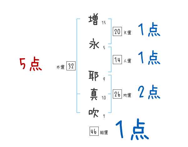 外運![]() | 増永耶真吹さんの外運は32画の5つ星!柔軟性があり成功する。チャンスが多く金運が良い。 生活面を象徴する運勢です。外部から受ける影響力を表し、結婚運、家庭運や職場、環境への順応性を表します。 |