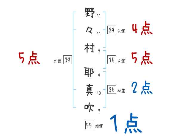 人運![]() | 野々村耶真吹さんの人運は16画の5つ星!人望が厚く大きく発展する。逆転成功が見える。 性格や才能などを表す2番目に重要な運勢です。人間関係や協調性、社会的な成功に影響します。主に20歳から50歳ぐらいまでの中年期の運勢を表します。 |