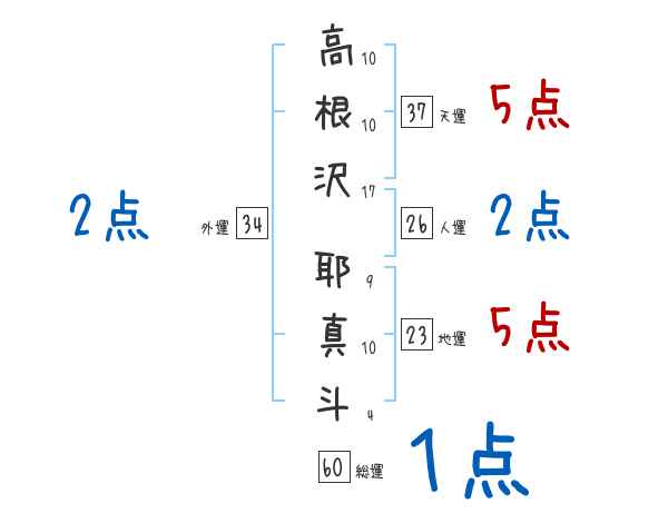 人運![]() | 高根沢耶真斗さんの人運は26画の2つ星!波瀾万丈かも。信頼できる人を大事にしましょう。 性格や才能などを表す2番目に重要な運勢です。人間関係や協調性、社会的な成功に影響します。主に20歳から50歳ぐらいまでの中年期の運勢を表します。 |