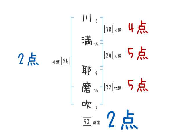 外運![]() | 川満耶磨吹さんの外運は26画の2つ星!波瀾万丈かも。信頼できる人を大事にしましょう。 生活面を象徴する運勢です。外部から受ける影響力を表し、結婚運、家庭運や職場、環境への順応性を表します。 |