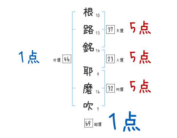 地運![]() | 根路銘耶磨吹さんの地運は32画の5つ星!柔軟性があり成功する。チャンスが多く金運が良い。 個性を表す基礎的な運勢です。性格形成や対人関係、行動力など家庭環境に影響されます。主に誕生してから20歳くらいまでの若年期の運勢を表します。 |