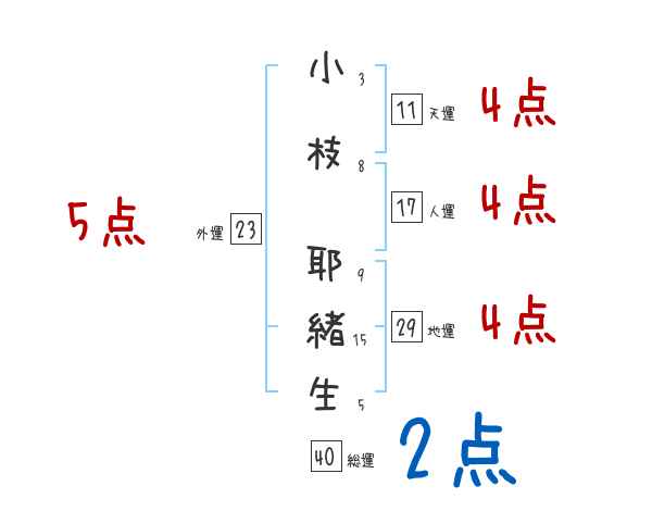 地運![]() | 小枝耶緒生さんの地運は29画の4つ星!完全主義で才能がある。厳格な心の持ち主。 個性を表す基礎的な運勢です。性格形成や対人関係、行動力など家庭環境に影響されます。主に誕生してから20歳くらいまでの若年期の運勢を表します。 |