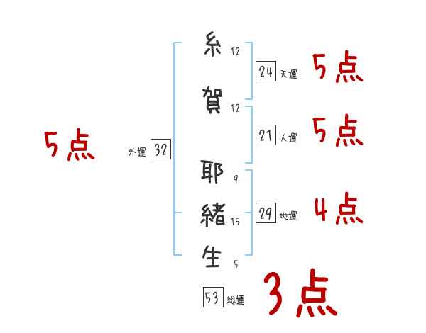 天運![]() | 糸賀耶緒生さんの天運は24画の5つ星!家庭運が良く順調な人生。金運にも恵まれる。 家系が持つ宿命的な運勢を表します。祖先から受け継いだ苗字ですので自分の力が及びません。家柄を象徴します。 |