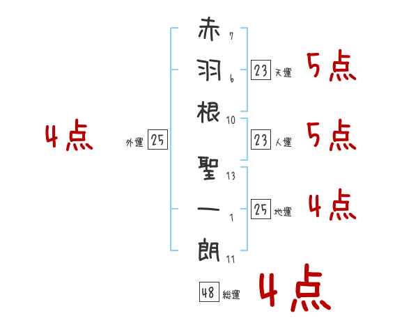 天運![]() | 赤羽根聖一朗さんの天運は23画の5つ星!想像力に優れ活力がある。一代で成功し名誉を手に入れる。 家系が持つ宿命的な運勢を表します。祖先から受け継いだ苗字ですので自分の力が及びません。家柄を象徴します。 |