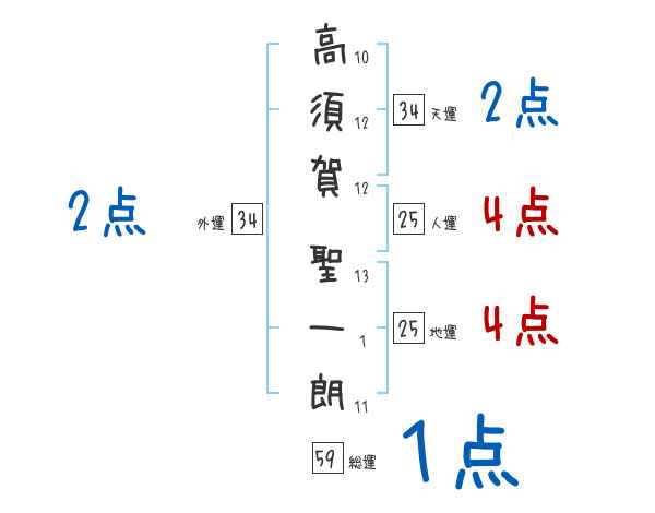 天運![]() | 高須賀聖一朗さんの天運は34画の2つ星!独創性に優れるが、自尊心が強く災難に注意しましょう。 家系が持つ宿命的な運勢を表します。祖先から受け継いだ苗字ですので自分の力が及びません。家柄を象徴します。 |