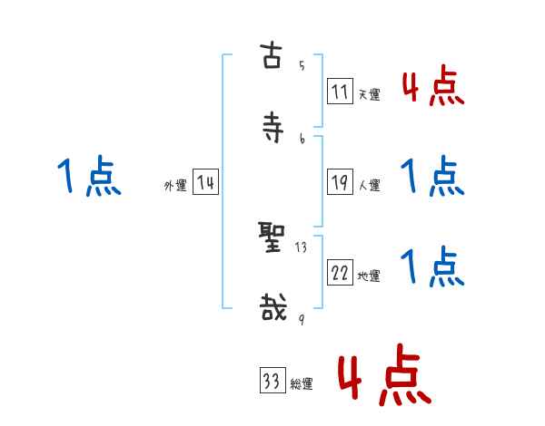 天運![]() | 古寺聖哉さんの天運は11画の4つ星!着実に富や地位を得る幸運な人生。 家系が持つ宿命的な運勢を表します。祖先から受け継いだ苗字ですので自分の力が及びません。家柄を象徴します。 |