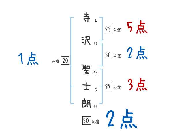 天運![]() | 寺沢聖士朗さんの天運は23画の5つ星!想像力に優れ活力がある。一代で成功し名誉を手に入れる。 家系が持つ宿命的な運勢を表します。祖先から受け継いだ苗字ですので自分の力が及びません。家柄を象徴します。 |