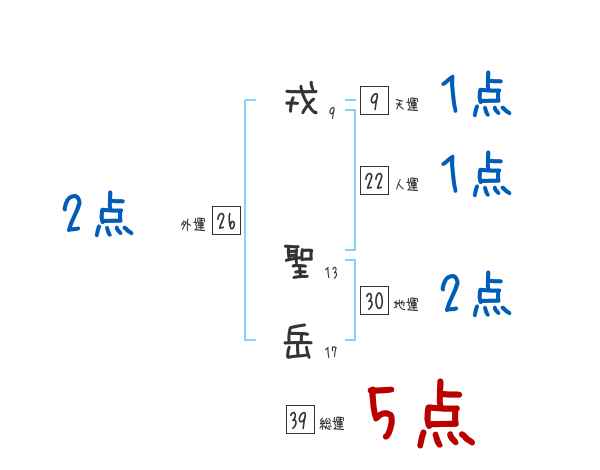 総運![]() | 戎聖岳さんの総運は39画の5つ星!社交性に優れ人望が厚い。人の上に立ち成功する。 あなたの人生を表す1番重要な運勢です。生涯を通じて影響する総合運となり、主に50歳以降の晩年期に影響を及ぼします。 |