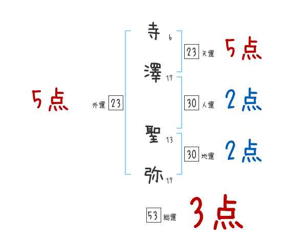 総運![]() | 寺澤聖弥さんの総運は53画の3つ星!やや見栄っ張りで虚栄心がある。散財に注意。 あなたの人生を表す1番重要な運勢です。生涯を通じて影響する総合運となり、主に50歳以降の晩年期に影響を及ぼします。 |