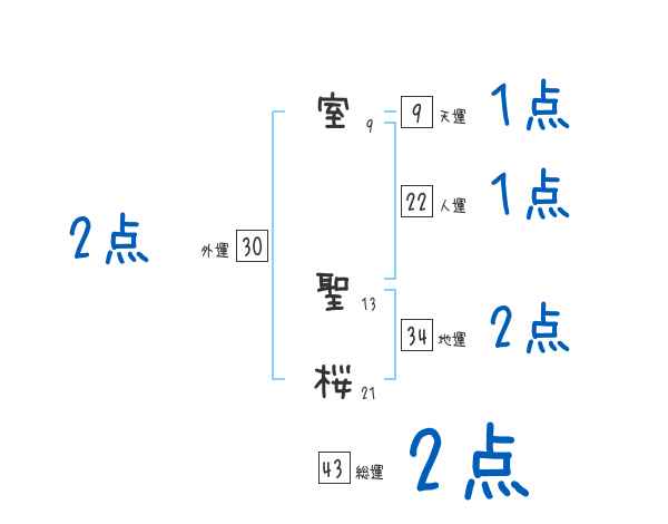 外運![]() | 室聖桜さんの外運は30画の2つ星!浮き沈みの激しさに注意しましょう。 生活面を象徴する運勢です。外部から受ける影響力を表し、結婚運、家庭運や職場、環境への順応性を表します。 |