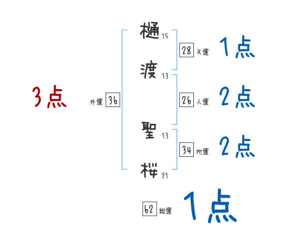 外運![]() | 樋渡聖桜さんの外運は36画の3つ星!先見性が豊かです。多少神経質で苦労することも。 生活面を象徴する運勢です。外部から受ける影響力を表し、結婚運、家庭運や職場、環境への順応性を表します。 |