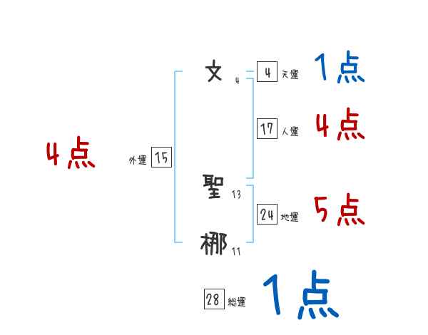 天運![]() | 文聖梛さんの天運は4画の1つ星!感情が不安定で苦労するかも。周囲との協調を心掛けましょう。 家系が持つ宿命的な運勢を表します。祖先から受け継いだ苗字ですので自分の力が及びません。家柄を象徴します。 |