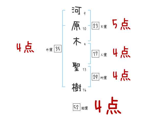 外運![]() | 河原木聖樹さんの外運は35画の4つ星!温厚な性格で感受性が高い。穏和な性格で人望が厚い。 生活面を象徴する運勢です。外部から受ける影響力を表し、結婚運、家庭運や職場、環境への順応性を表します。 |
