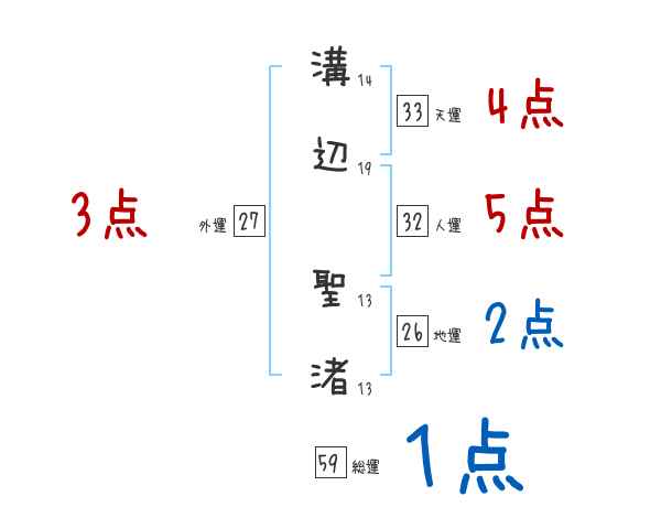 人運![]() | 溝辺聖渚さんの人運は32画の5つ星!柔軟性があり成功する。チャンスが多く金運が良い。 性格や才能などを表す2番目に重要な運勢です。人間関係や協調性、社会的な成功に影響します。主に20歳から50歳ぐらいまでの中年期の運勢を表します。 |
