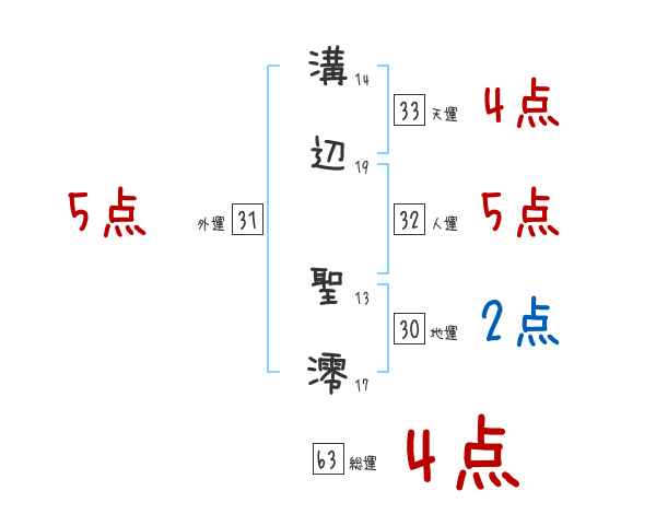 人運![]() | 溝辺聖澪さんの人運は32画の5つ星!柔軟性があり成功する。チャンスが多く金運が良い。 性格や才能などを表す2番目に重要な運勢です。人間関係や協調性、社会的な成功に影響します。主に20歳から50歳ぐらいまでの中年期の運勢を表します。 |