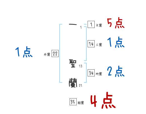天運![]() | 一聖蘭さんの天運は1画の5つ星!行動力、指導力があり出世し繁栄する。幸運に恵まれる。 家系が持つ宿命的な運勢を表します。祖先から受け継いだ苗字ですので自分の力が及びません。家柄を象徴します。 |