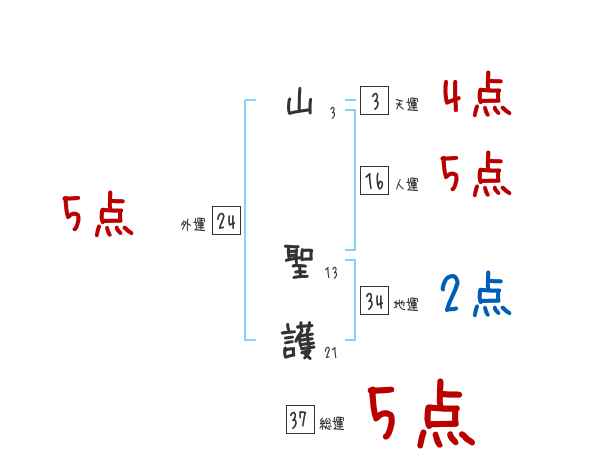 天運![]() | 山聖護さんの天運は3画の4つ星!活動的で才能に恵まれ、多くの信頼を得る。希望に満ち成長する。 家系が持つ宿命的な運勢を表します。祖先から受け継いだ苗字ですので自分の力が及びません。家柄を象徴します。 |