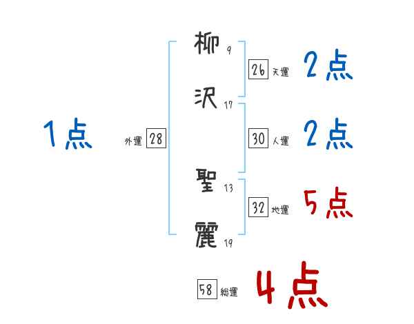 外運![]() | 柳沢聖麗さんの外運は28画の1つ星!家庭環境に注意。スポーツで活躍できる能力があるかも。 生活面を象徴する運勢です。外部から受ける影響力を表し、結婚運、家庭運や職場、環境への順応性を表します。 |