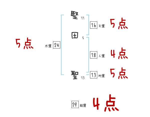 天運![]() | 堅田聖さんの天運は16画の5つ星!人望が厚く大きく発展する。逆転成功が見える。 家系が持つ宿命的な運勢を表します。祖先から受け継いだ苗字ですので自分の力が及びません。家柄を象徴します。 |