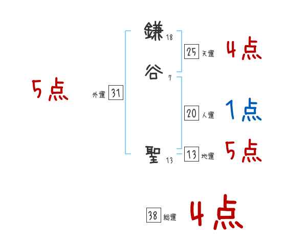天運![]() | 鎌谷聖さんの天運は25画の4つ星!個性があり才能があふれる。強運の持ち主で発展する。 家系が持つ宿命的な運勢を表します。祖先から受け継いだ苗字ですので自分の力が及びません。家柄を象徴します。 |