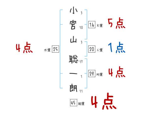 総運![]() | 小宮山聡一朗さんの総運は45画の4つ星!もくもくと物事を進め達成する。地味な努力家。 あなたの人生を表す1番重要な運勢です。生涯を通じて影響する総合運となり、主に50歳以降の晩年期に影響を及ぼします。 |