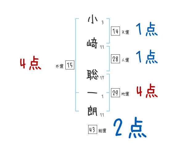 外運![]() | 小﨑聡一朗さんの外運は15画の4つ星!人徳があり出世する。順調に物事を進め円満な人生。 生活面を象徴する運勢です。外部から受ける影響力を表し、結婚運、家庭運や職場、環境への順応性を表します。 |