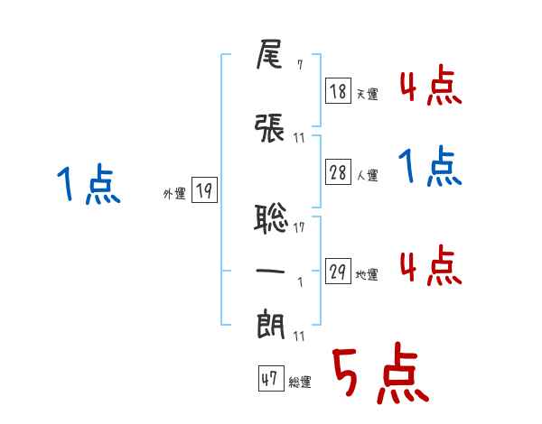 人運![]() | 尾張聡一朗さんの人運は28画の1つ星!家庭環境に注意。スポーツで活躍できる能力があるかも。 性格や才能などを表す2番目に重要な運勢です。人間関係や協調性、社会的な成功に影響します。主に20歳から50歳ぐらいまでの中年期の運勢を表します。 |