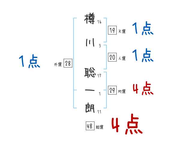 外運![]() | 樽川聡一朗さんの外運は28画の1つ星!家庭環境に注意。スポーツで活躍できる能力があるかも。 生活面を象徴する運勢です。外部から受ける影響力を表し、結婚運、家庭運や職場、環境への順応性を表します。 |