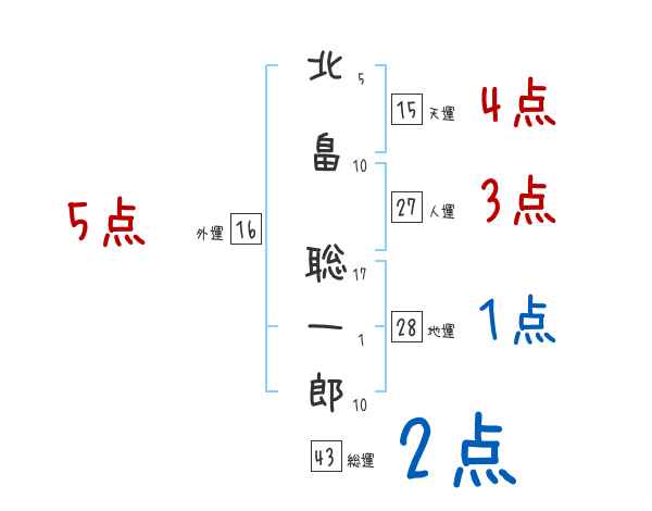 外運![]() | 北畠聡一郎さんの外運は16画の5つ星!人望が厚く大きく発展する。逆転成功が見える。 生活面を象徴する運勢です。外部から受ける影響力を表し、結婚運、家庭運や職場、環境への順応性を表します。 |