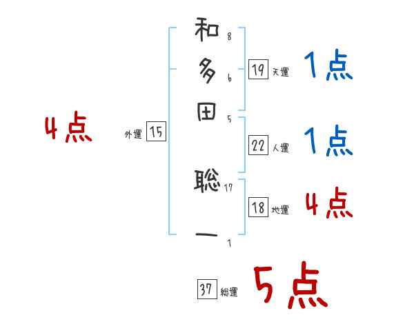 総運![]() | 和多田聡一さんの総運は37画の5つ星!努力家で順応性に優れる。現実的な考え方ができ忠実に物事をこなす。 あなたの人生を表す1番重要な運勢です。生涯を通じて影響する総合運となり、主に50歳以降の晩年期に影響を及ぼします。 |