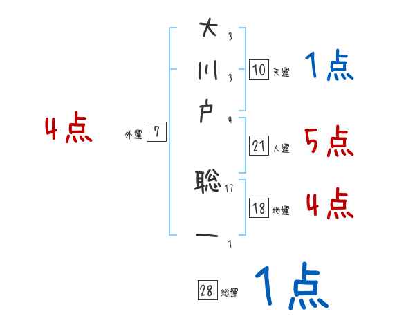 総運![]() | 大川戸聡一さんの総運は28画の1つ星!家庭環境に注意。スポーツで活躍できる能力があるかも。 あなたの人生を表す1番重要な運勢です。生涯を通じて影響する総合運となり、主に50歳以降の晩年期に影響を及ぼします。 |