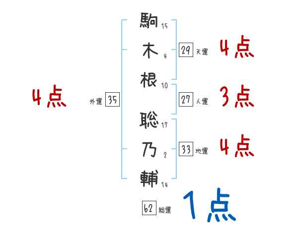 天運![]() | 駒木根聡乃輔さんの天運は29画の4つ星!完全主義で才能がある。厳格な心の持ち主。 家系が持つ宿命的な運勢を表します。祖先から受け継いだ苗字ですので自分の力が及びません。家柄を象徴します。 |