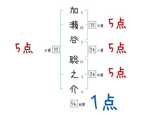 外運![]() | 加瀬谷聡之介さんの外運は32画の5つ星!柔軟性があり成功する。チャンスが多く金運が良い。 生活面を象徴する運勢です。外部から受ける影響力を表し、結婚運、家庭運や職場、環境への順応性を表します。 |