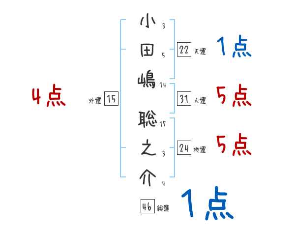 天運![]() | 小田嶋聡之介さんの天運は22画の1つ星!努力することが苦手ないっぽう手先が器用。芸術性にも優れる。 家系が持つ宿命的な運勢を表します。祖先から受け継いだ苗字ですので自分の力が及びません。家柄を象徴します。 |