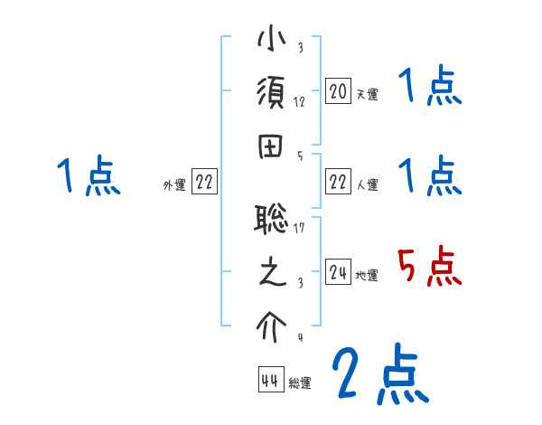 人運![]() | 小須田聡之介さんの人運は22画の1つ星!努力することが苦手ないっぽう手先が器用。芸術性にも優れる。 性格や才能などを表す2番目に重要な運勢です。人間関係や協調性、社会的な成功に影響します。主に20歳から50歳ぐらいまでの中年期の運勢を表します。 |