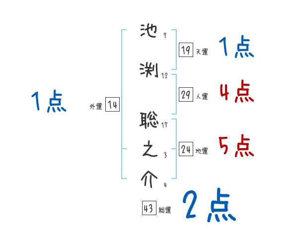 天運![]() | 池渕聡之介さんの天運は19画の1つ星!優れた才能を持ちますが、協調性が足りないことも。周りの人と協力する事を意識しましょう。 家系が持つ宿命的な運勢を表します。祖先から受け継いだ苗字ですので自分の力が及びません。家柄を象徴します。 |