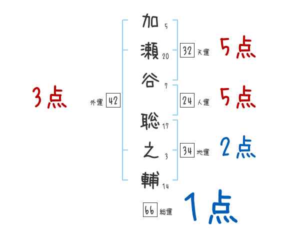 天運![]() | 加瀬谷聡之輔さんの天運は32画の5つ星!柔軟性があり成功する。チャンスが多く金運が良い。 家系が持つ宿命的な運勢を表します。祖先から受け継いだ苗字ですので自分の力が及びません。家柄を象徴します。 |