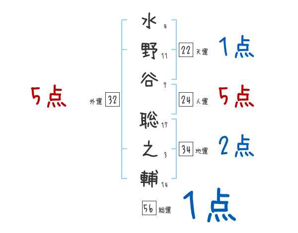 外運![]() | 水野谷聡之輔さんの外運は32画の5つ星!柔軟性があり成功する。チャンスが多く金運が良い。 生活面を象徴する運勢です。外部から受ける影響力を表し、結婚運、家庭運や職場、環境への順応性を表します。 |