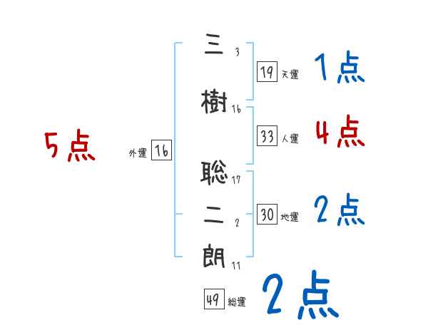 外運![]() | 三樹聡二朗さんの外運は16画の5つ星!人望が厚く大きく発展する。逆転成功が見える。 生活面を象徴する運勢です。外部から受ける影響力を表し、結婚運、家庭運や職場、環境への順応性を表します。 |