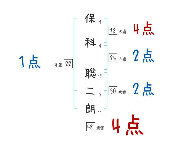 天運![]() | 保科聡二朗さんの天運は18画の4つ星!情熱的で剛気。忍耐力があり信頼される。 家系が持つ宿命的な運勢を表します。祖先から受け継いだ苗字ですので自分の力が及びません。家柄を象徴します。 |