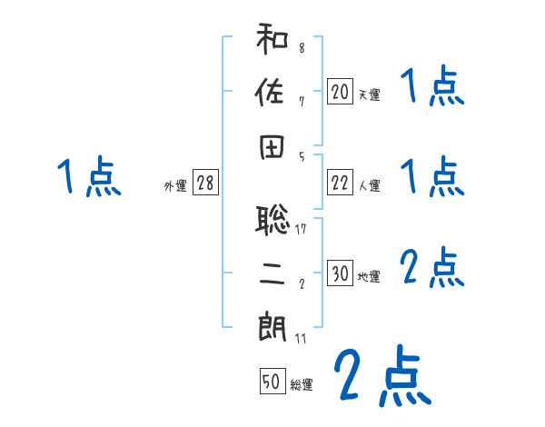 外運![]() | 和佐田聡二朗さんの外運は28画の1つ星!家庭環境に注意。スポーツで活躍できる能力があるかも。 生活面を象徴する運勢です。外部から受ける影響力を表し、結婚運、家庭運や職場、環境への順応性を表します。 |
