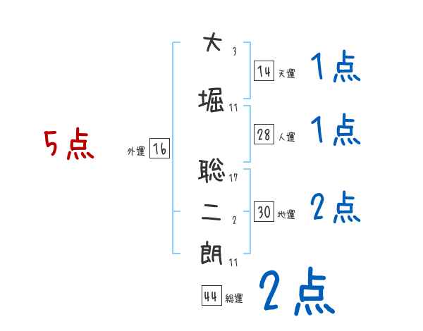 外運![]() | 大堀聡二朗さんの外運は16画の5つ星!人望が厚く大きく発展する。逆転成功が見える。 生活面を象徴する運勢です。外部から受ける影響力を表し、結婚運、家庭運や職場、環境への順応性を表します。 |