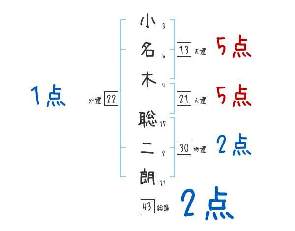 総運![]() | 小名木聡二朗さんの総運は43画の2つ星!頑固な性格で独立心が強いかも。やや非現実的で浪費に注意しましょう。 あなたの人生を表す1番重要な運勢です。生涯を通じて影響する総合運となり、主に50歳以降の晩年期に影響を及ぼします。 |