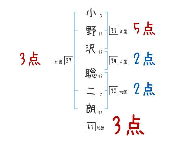 天運![]() | 小野沢聡二朗さんの天運は31画の5つ星!社交性があり判断力に優れる。順風満帆な人生で円満な生活。 家系が持つ宿命的な運勢を表します。祖先から受け継いだ苗字ですので自分の力が及びません。家柄を象徴します。 |