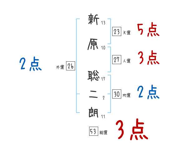 天運![]() | 新原聡二朗さんの天運は23画の5つ星!想像力に優れ活力がある。一代で成功し名誉を手に入れる。 家系が持つ宿命的な運勢を表します。祖先から受け継いだ苗字ですので自分の力が及びません。家柄を象徴します。 |