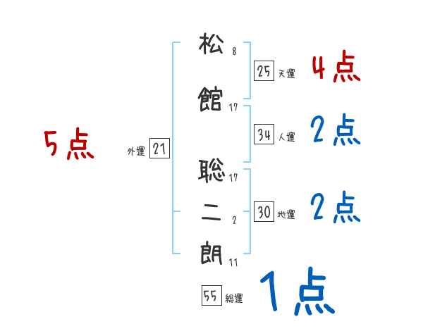 外運![]() | 松館聡二朗さんの外運は21画の5つ星!統率力がある。独立し成功する。名誉を手に入れる。 生活面を象徴する運勢です。外部から受ける影響力を表し、結婚運、家庭運や職場、環境への順応性を表します。 |